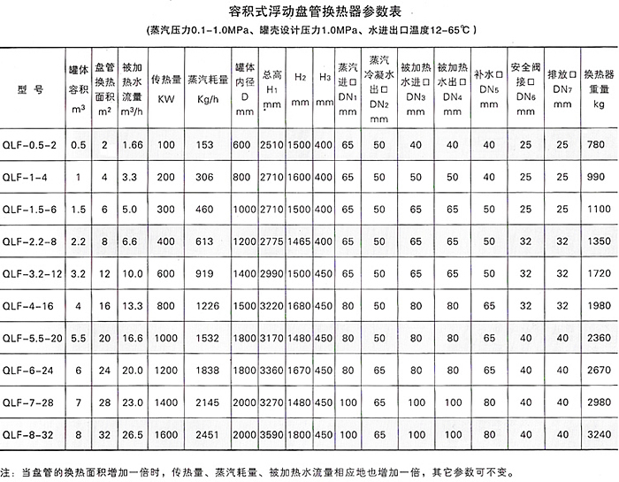 The selection of volumetric floating coil heat exchanger is mainly based on the flow of water. The flow of water in the table refers to the working condition of continuous water supply. When water supply is interrupted, the model of heat exchanger can be appropriately reduced. According to the working conditions and requirements of users, the heat exchange area of the coil can be appropriately increased or decreased on the basis of a certain type of tank. The bearing pressure of the tank volume is generally 1.0Mpa, and the pressure level of the tank can be increased according to the working conditions and requirements of users.